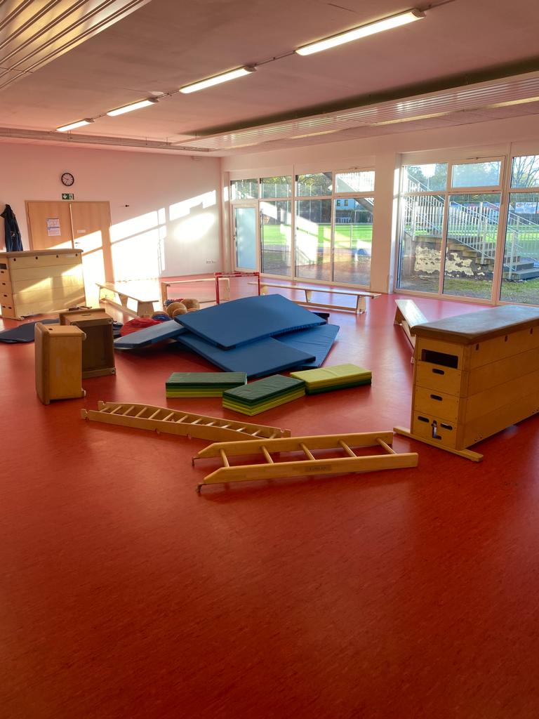 Baumstämme, Steine und Felsen lagen zum Höhlenbau bereit. Mit verschiedenen Materialien aus der Sporthalle konnten die Kinder die Schlafplätze der Tiere für den Winterschlaf bauen. Tolle Bauwerke entstanden in der Sportstunde.