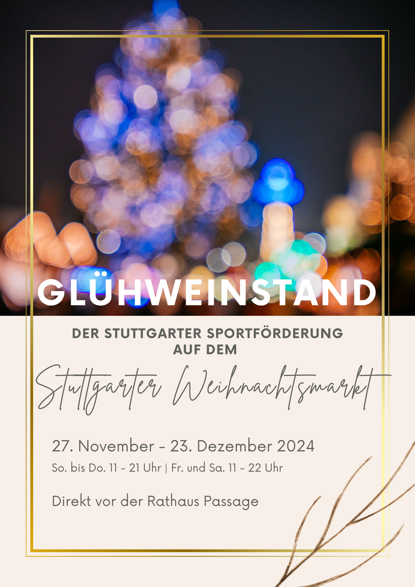 Vom 27. November bis 23. Dezember 2024 lädt die Stuttgarter Sportförderung herzlich ein, ihren traditionellen Glühweinstand auf dem Stuttgarter Weihnachtsmarkt zu besuchen! Der Stand befindet sich wie gewohnt neben der Rathaus Passage und bietet neben köstlichem Glühwein auch alkoholfreien Punsch für alle, die auf Alkohol verzichten möchten.